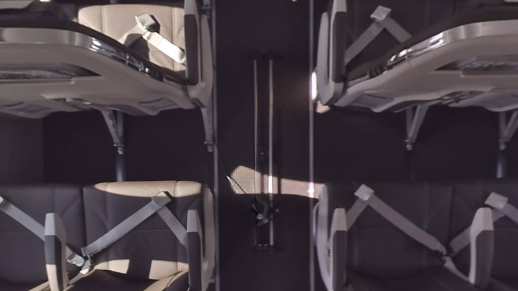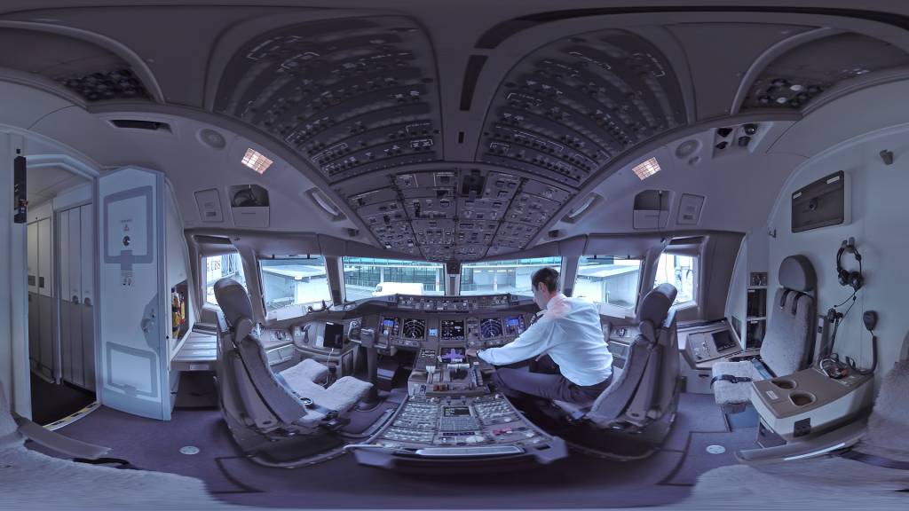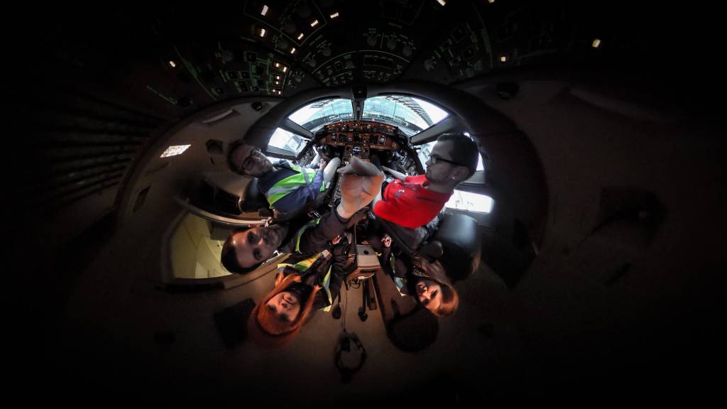 Unser Haupt-Rig war ein kleines Zwei-Kamera-Back-to-Back-Rig mit 220-Grad-Entaniya-Objektiven. Dieses Setup hatte den grossen Vorteil von nur einer Stitching-Achse und einer minimalen Parallaxenverschiebung aufgrund der kompakten Platzierung der Kameras. Ein weiterer grosser Vorteil war die Möglichkeit, die Stitching-Achse während der Aufnahme auf einen beliebigen Punkt zu setzen. Zum Beispiel hinter den Sitzen in einem Cockpit.