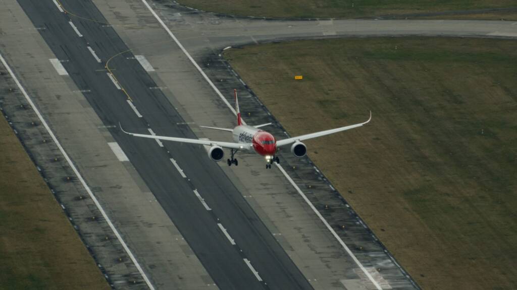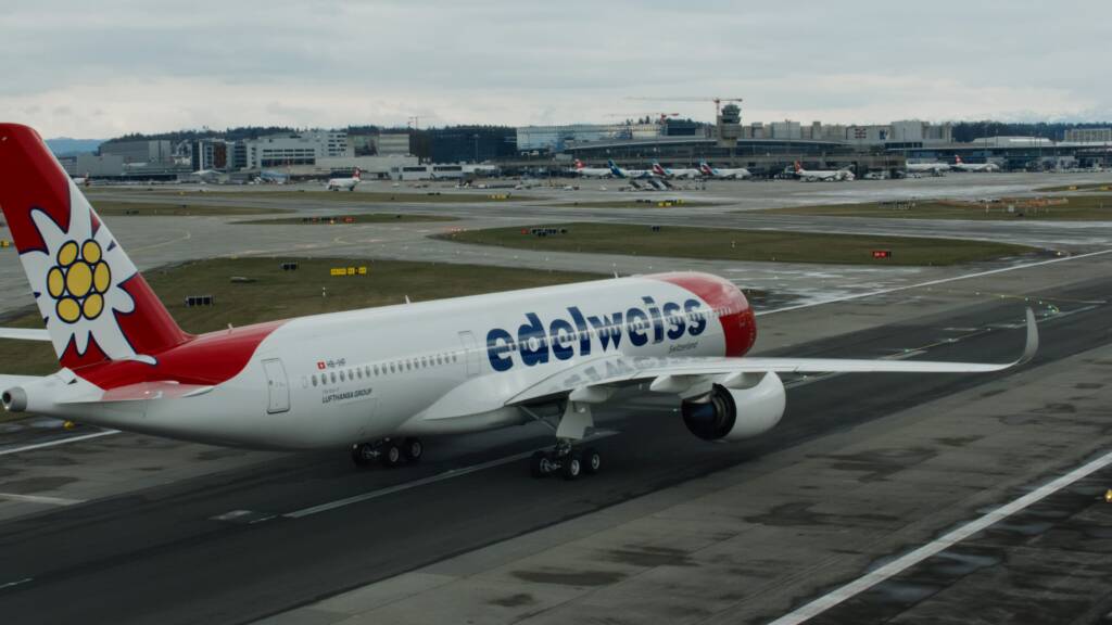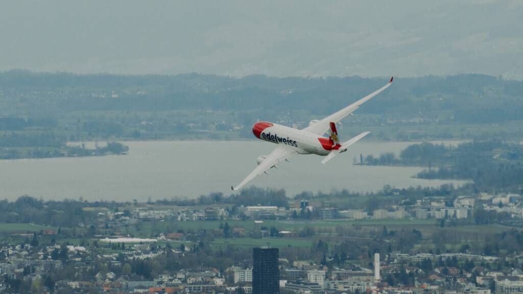 Um den ersten Touchdown hautnah mitzuerleben, haben wir die Landung im Parallelflug aus einem Helikopter im eigens dafür gesperrten Luftraum über dem Flughafen Zürich aufgenommen. Das Ergebnis ist eine ganz neue Perspektive aus nächster Nähe auf den landenden A350 in der neuen Edelweiss-Livery.