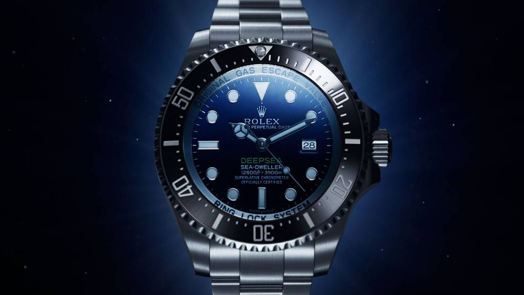 Die Rolex Deepsea D-Blue wurde gemeinsam mit dem Dokumentarfilm “Deepsea Challenge 3D” von James Cameron an der Premiere im American Museum of Natural History in New York vorgestellt. Die grüne Schrift symbolisiert dabei das U-Boot mit dem der Blockbuster Regisseur 2012 in den Marianengraben auf 10’908m abgetaucht ist.