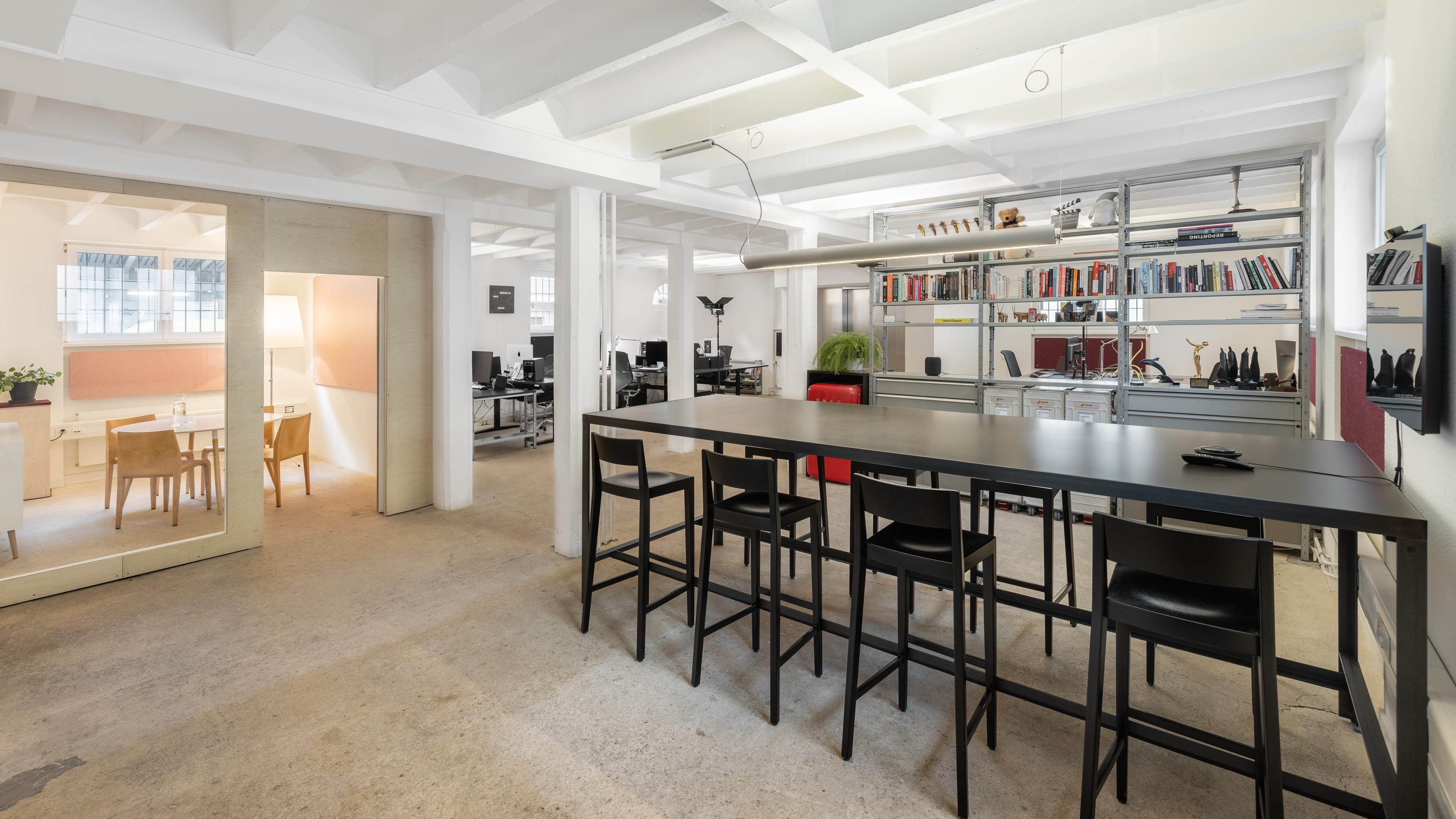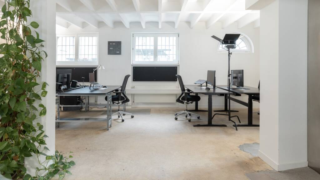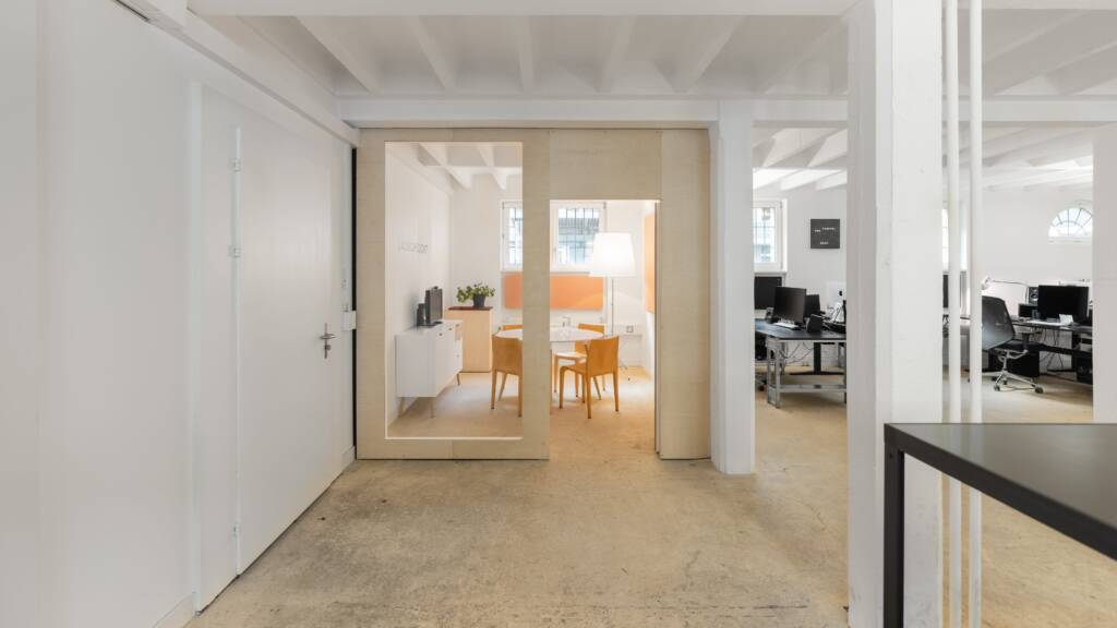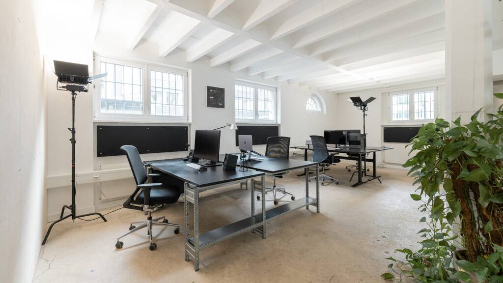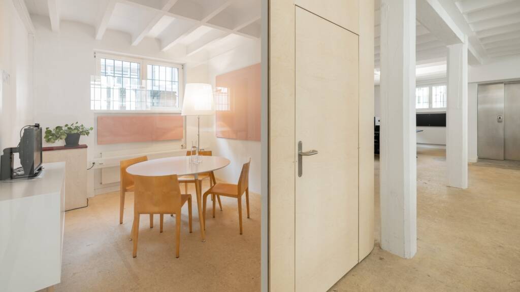 Es gibt einen grossen Tisch für Meetings, Workshops und Mittagessen, eine kleine Küche mit unserer Dalla Corte, ein separates Sitzungszimmer und einen voll ausgestatteten Raum im UG für Präsentationen oder Besprechungen sowie ein Bad mit Dusche.